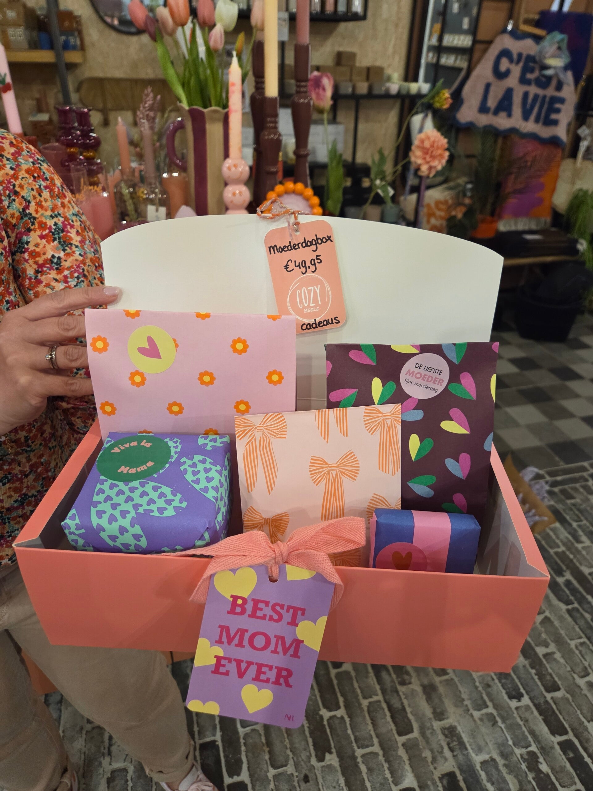 In de box zitten 5 super leuke cadeaus en een kaartje waarop je zelf nog wat liefs kan schrijven. Al dit leuks voor 49,95. Bestellen kan in onze webshop, via een dm of bij ons in de winkel. De week voor Moederdag kunnen de pakketten afgehaald worden in de winkel.